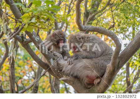 在嵐山猴園岩田山分園,日本獼猴在樹上梳理毛髮。