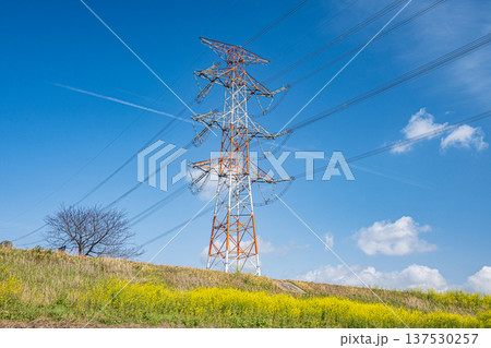 從淀川河堤下望去,可以看到一座輸電塔,河堤上盛開著野花,地點是大阪府高槻市。