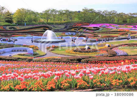 開花在有噴泉的一個公園的鬱金香和蝴蝶花