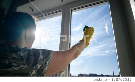 Woman cleans window on sunny day in urban setting while wearing gloves