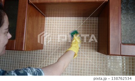 Person cleans kitchen wall with sponge and gloves in a home setting during day