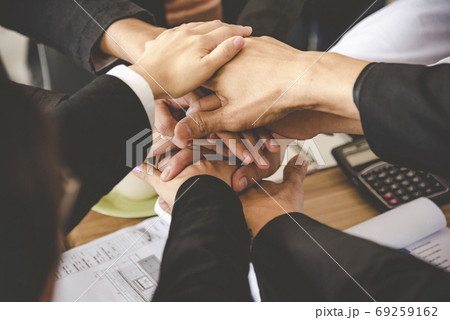 Teamwork business people join hands in meeting.