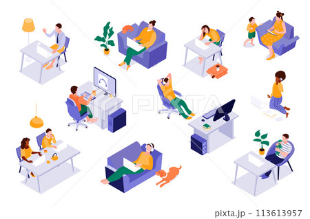Isometric work from home illustration collection with people