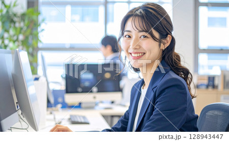 一位年輕的女職員在乾淨的辦公室微笑著操作電腦