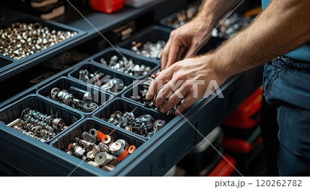 Close up of a mechanic hands sorting through a toolbox drawer filled with various nuts, bolts, and fasteners. Concept of organization, repair, workshop.