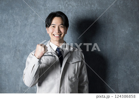 一名身著工作服的男子麵帶微笑,握緊拳頭。建築管理和工廠的工業影像,看著相機。