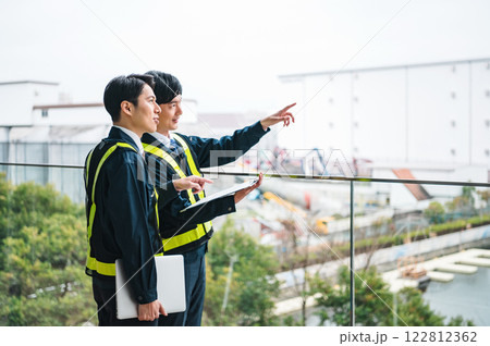 男總工程師講解施工進度、網路進度、施工監造、頭盔2人