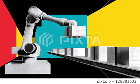Collage pop art illustration of futuristic manufacturing and factory concept, Robotic arm handling boxes in a colorful industrial setting.