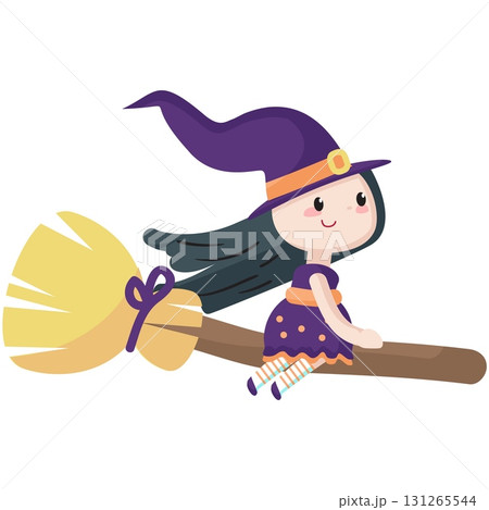 happy young witch girl in cute cartoon style flying on broomstick halloween nigh