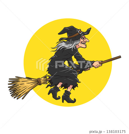 Scary witch with broomstick raster illustration