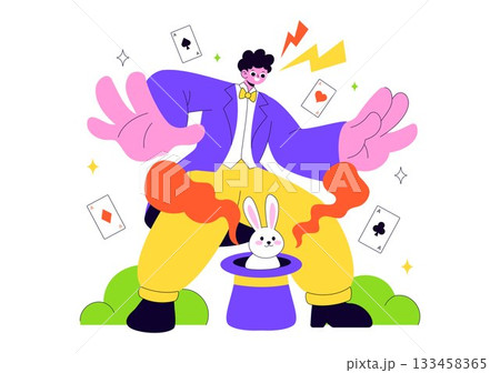 Magician Vector Illustration with Illusionist Conjuring Tricks and Waving a Magic Wand above his Mysterious Hat on a Stage in Flat Cartoon Background