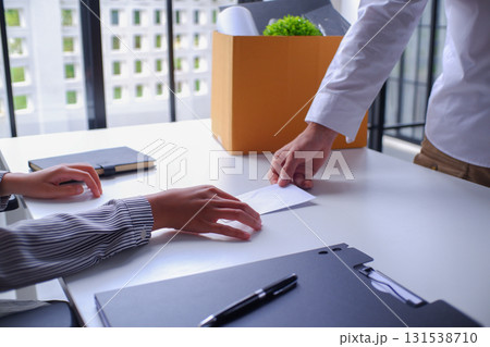 Man places personal items and resignation letter into a box, ending his tenure.