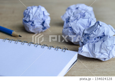 A closeup view of crumpled sheets of paper resting near a spiral notebook and pencil. Work in progress concept.