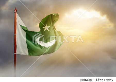Human hand holding the Pakistan national flag with a flying pigeon bird. Concept of Pakistan Independence Day. Collage art