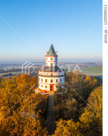 The Baroque Humprecht chateau overlooks Sobotka, bathed in the warm glow of autumn sunlight. Vibrant foliage surrounds the distinctive elliptical structure, creating a stunning landscape.