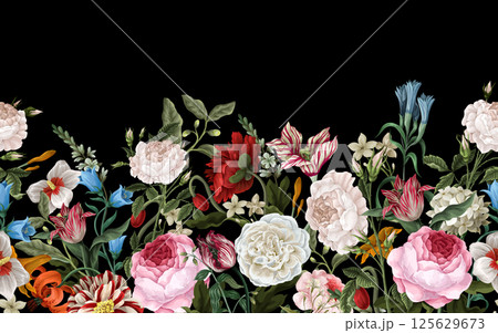 Border pattern with oil painting rococo still-lifes flowers. Vector.