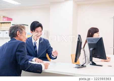 一名男子在櫃檯為老年顧客服務