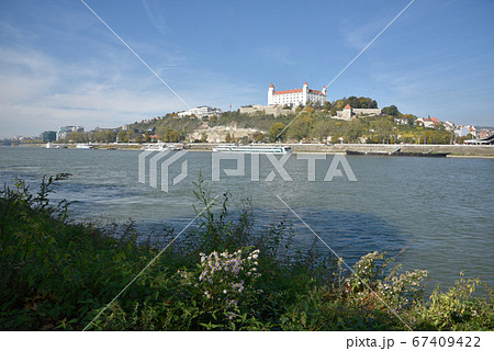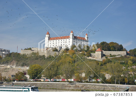 天空是一群飛翔的小鳥,位於艾塔的河邊堡壘城堡和山形的布城堡。
