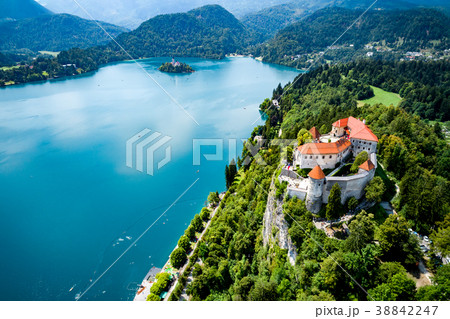 Aerial view of Bled Castle overlooking Lake Bled in Slovenia, Europe