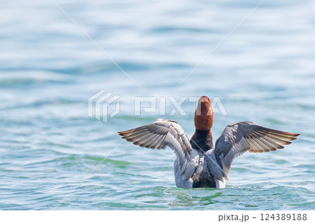 瀨戶內海中一隻展翅的紅頭潛鴨
