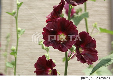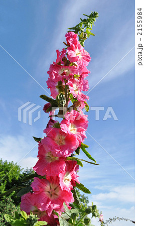 Pink hollyhock in a garden outdoors, alcea rosea, althaea rosea