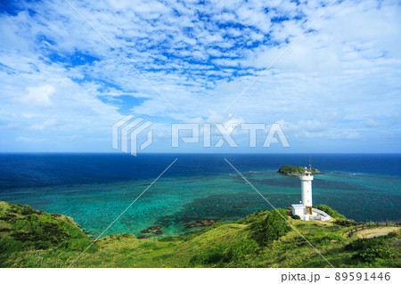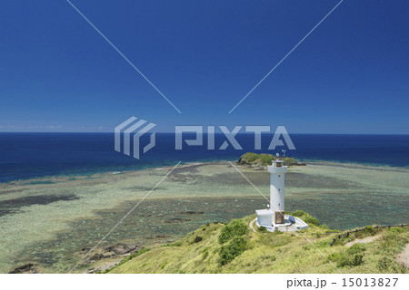 熱帶圖像 沖繩縣石垣島的白色燈塔和藍色珊瑚礁海 平久崎燈塔