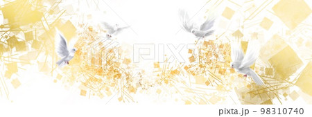 平安藝術風格的金銀砂和日式雲彩背景以及和平舞蹈的象徵與幸運符的白鴿插圖和諧共舞