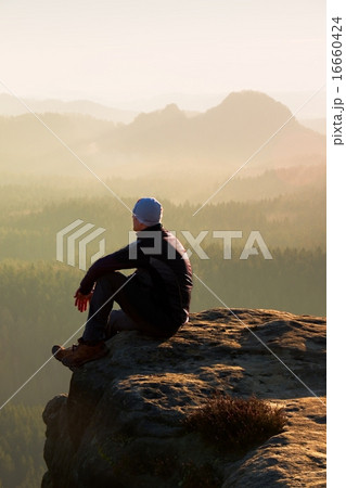 Climbing adult man at the top of rocky peak