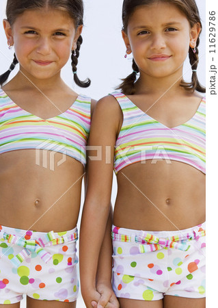 Hispanic sisters wearing matching bathing suits