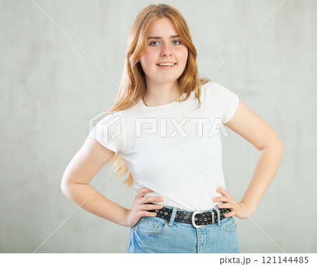 Happy smiling teenage girl, student in casual clothes looking at camera at gray wall background, copy space for mock up