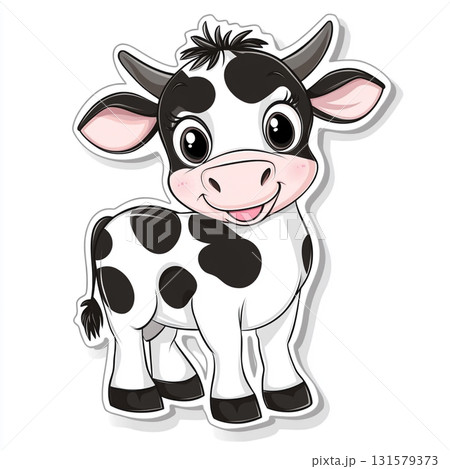 A cute cartoon cow with a white face and brown spots. The cow is smiling and looking at the camera