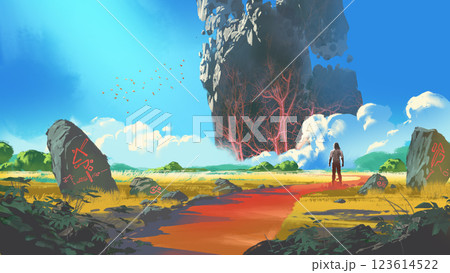 Floating islands of rocky land with lava eruption