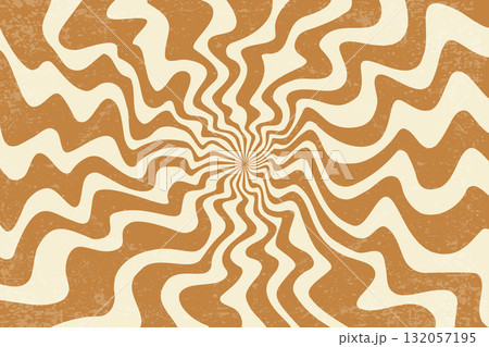 Groovy retro background with pattern of spiral psychedelic caramel and cream wavy rays. 70s abstract swirl vector sunburst design. Vintage funky radial candy poster. Striped playful circular bg