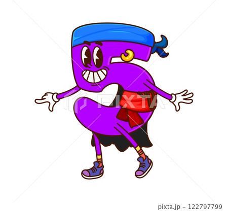 Groovy cartoon number 5 pirate corsair or Caribbean captain, vector character. Funny groovy math number Five 5 as pirate sailor in bandana with corsair golden earring as pirate cartoon character