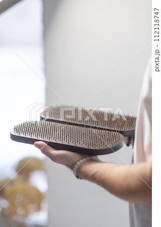 Sadhu board, yoga board with nails, guy stands on the board with nails, yoga concept