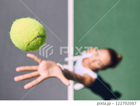 Tennis ball, sports and female player throwing and serving on a court outside from above. Athletic woman playing game for competitive fun with copy space. Sporty woman preparing for a game