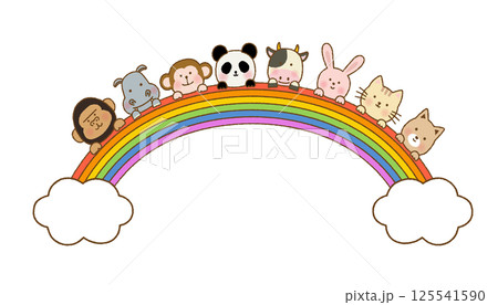 手繪風格:彩虹上排成一排的可愛動物 |向量素材|用於框架和裝飾品