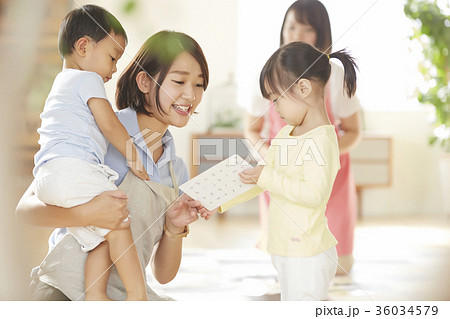 一個穿著西裝的女人正在與她的父母和孩子交談