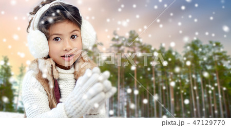 Funny little kid boy in colorful clothes playing outdoors during snowfall. Active leisure with