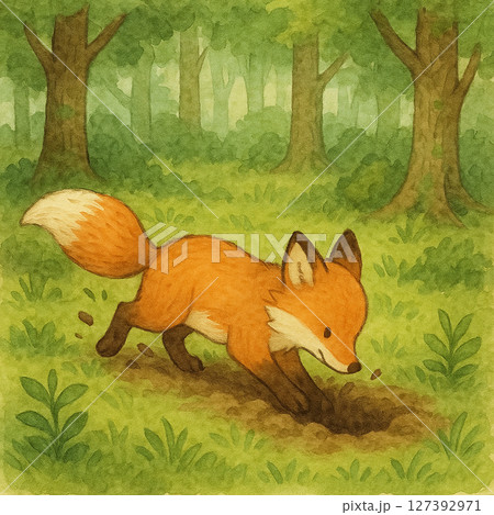 森林裡挖洞的小狐狸|かわいいキツネ × 探索森林 × 水彩插畫