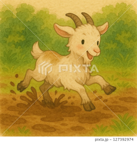 開心跳躍的山羊在泥地玩耍|泥んこ遊びをするヤギの子 × 可愛水彩插圖
