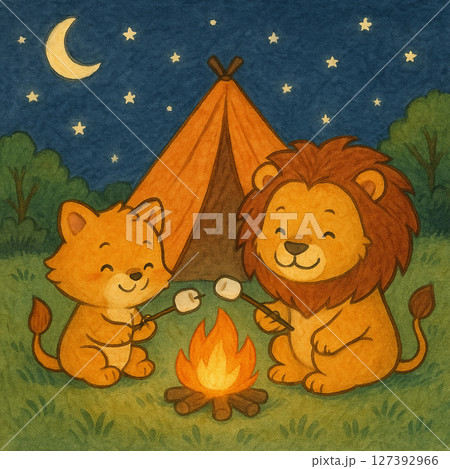 森林露營之夜|獅子親子烤棉花糖插畫 × 星夜 × 動物野營