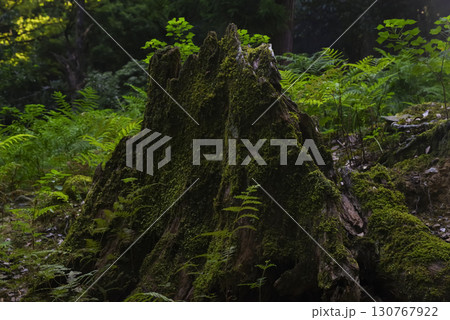 長滿苔蘚的樹樁和蕨類植物的森林景觀