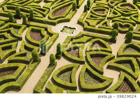 Autumn view of the formal gardens at Chateau de Champs-sur-Marne near Paris in France. Colorful fall foliage and sculpted topiaries line the path leading to a fountain