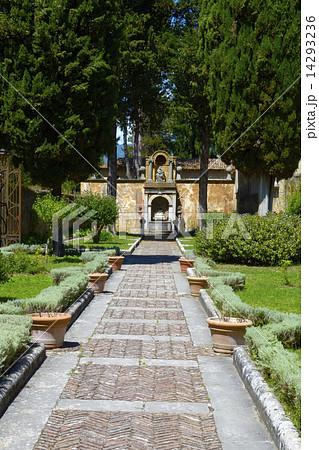 The Patio de la Acequia, courtyard of the Generalife palace at the Alhambra complex in Granada town, Andalusia, Spain. Serene courtyard garden with fountain and classical architecture.