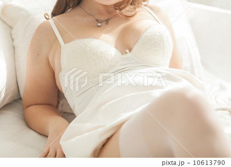 A young attractive girl with very large Breasts in underwear lies on her back and straightens her hair on her head.