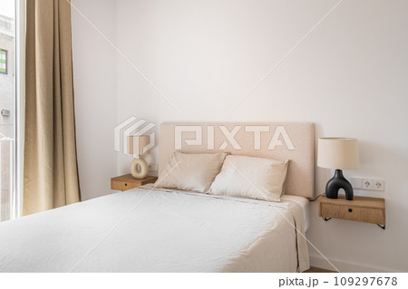 Modern Minimalism Style Bedroom Interior In Beige and grey Tones