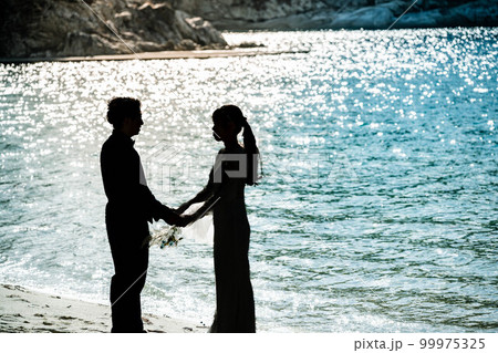 新娘和新郎在沙灘上互相看著對方