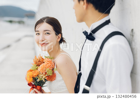 新娘和新郎拿著花束,看著對方