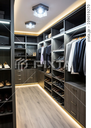 Elegant minimalist male walk in wardrobe with clothes hanging on rods, shelves and drawers.